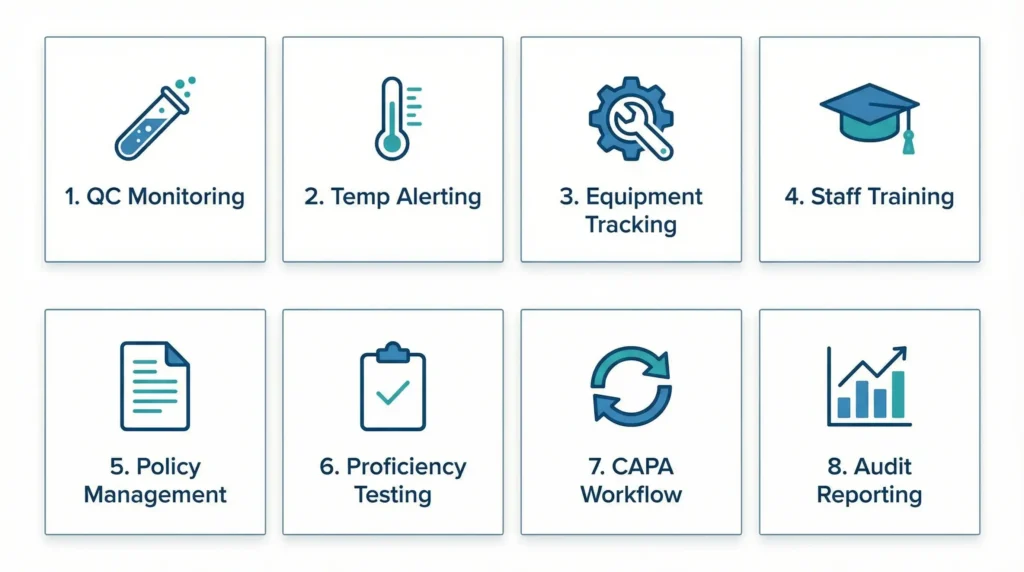 A strong automated compliance setup usually includes several connected functions. Each one supports a part of the lab’s daily compliance work.